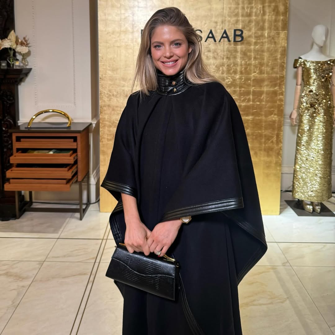 في اللوك الثاني، اتّجهت كريستينا نحو خيارات أكثر جرأةً وأناقة، حيث ارتدت كاباً طويلاً باللون الأسود جاء بقصّة واسعة تمنح حرية في الحركة وتضفي حضوراً قوياً. تميّز الكاب بتفاصيل جلدية على الحواف والياقة العالية، ما أضفى عليه لمسة فاخرة حوّلته من قطعة عملية إلى تصميم يليق بالأناقة المسائية الراقية.