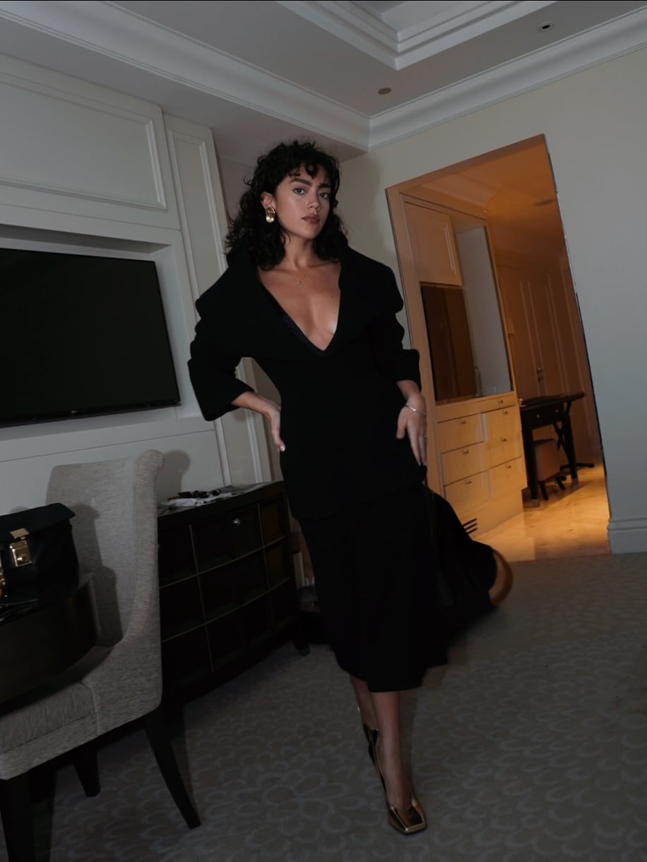 تألقت ستيفاني بفستان باللون الأسود الميدي من جيفنشي، اتسم بملامح مستوحاة من أسلوب الريترو الكلاسيكي، إلا أنّ جرأته ظهرت بوضوح من خلال فتحة الصدر الطويلة على شكل V، التي منحت التصميم لمسة حداثية قوية.