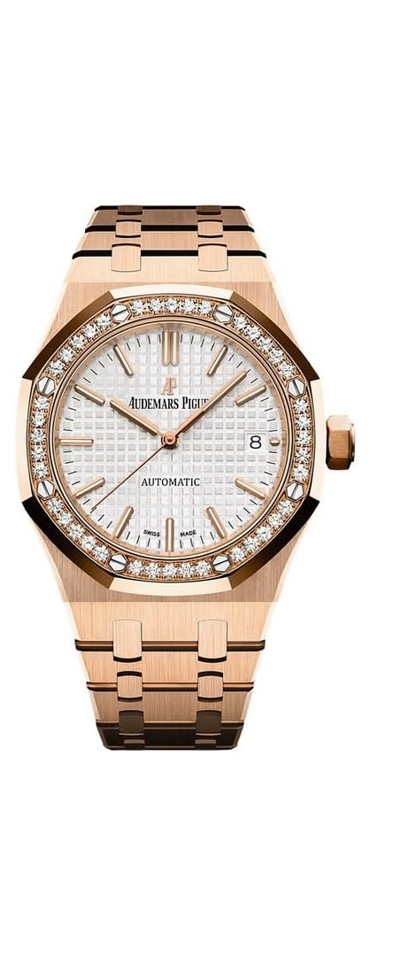 هنا الزاهد تميل دائماً إلى الإطلالات الأنثوية الراقية، وقد ظهر ذلك جلياً في الساعة التي اختارتها من مجموعة Royal Oak. الساعة بقياس 37 مم وبحركة أوتوماتيكية، تأتي بهيكل من الذهب الوردي عيار 18 قيراطاً، مع إطار مرصّع بالألماس يضيف بريقاً هادئاً يناسب أسلوبها الناعم. أما المينا الأزرق فيمنحها طابعاً ملكياً جذاباً، وتأتي العقارب المصنوعة من الذهب الوردي لإكمال هذا التناسق الدافئ. يكتمل التصميم بسوار من الذهب الوردي، فيما تضم الحركة الداخلية 29 حجراً كريماً مصنّعاً واحتياطي طاقة يصل إلى 60 ساعة.