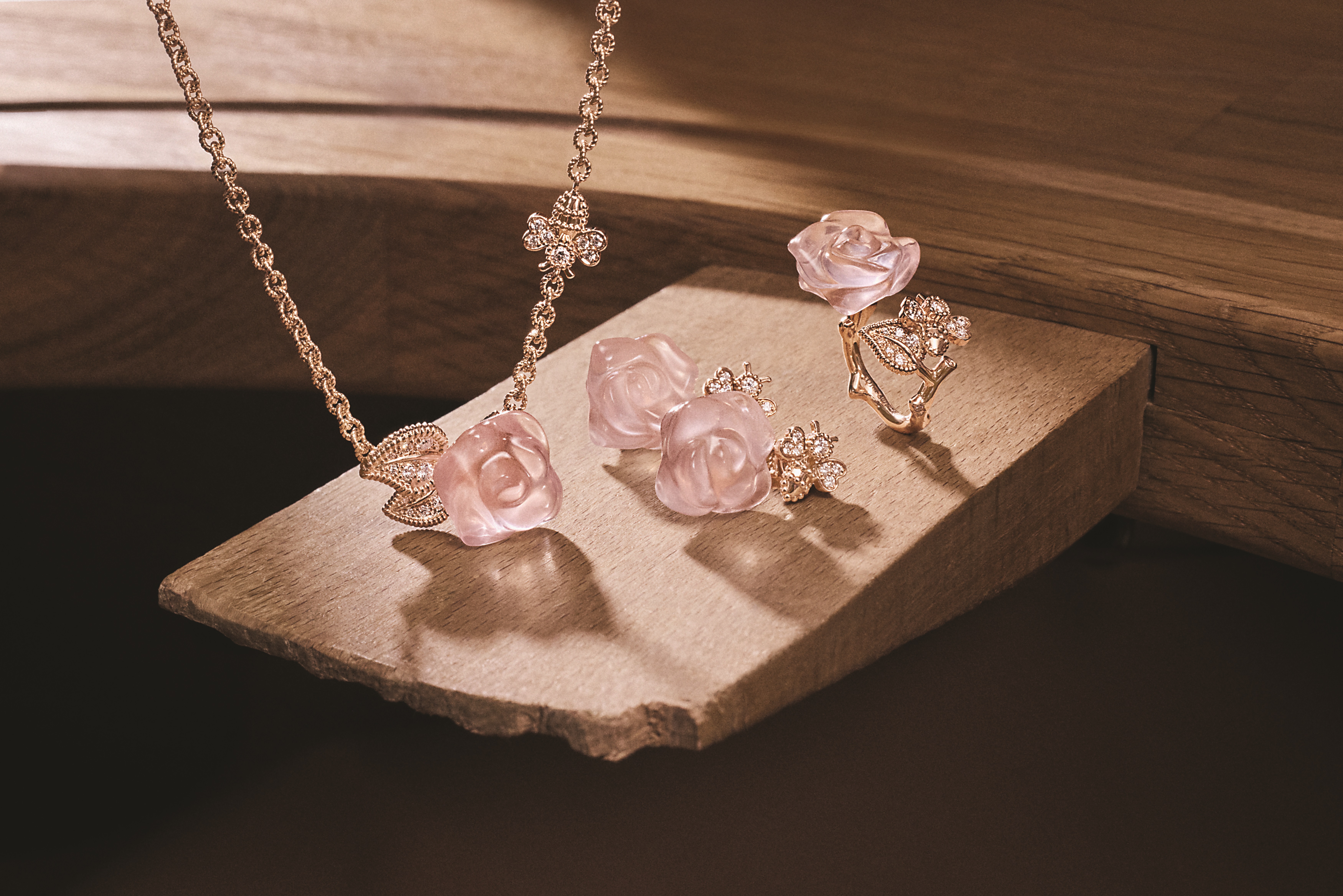 تستعرضVictoire de Castellane في تصاميمها الجديدة رؤيةً متجدّدة لزهرة الوردة، حيث تقدّم Bois de Rose قلادتين استثنائيتين: الأولى من الذهب الأبيض على سلسلة رفيعة، والثانية مصمّمة من لآلئ المياه العذبة، مقدّمة للمرة الأولى ضمن هذه المجموعة، ومزدانة بمشبك من الذهب الوردي. هذه القطع تمثّل التوازن المثالي بين البساطة والفخامة، وبين الحيوية الطبيعية والدقة الحِرفية.