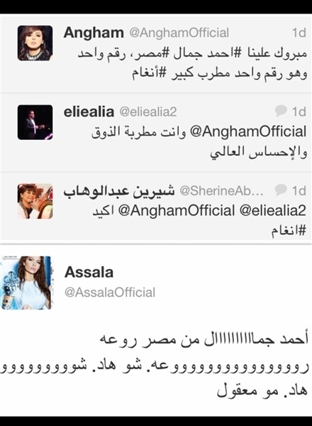 الفنانة أنغام: "مبروك علينا #أحمد جمال #مصر، رقم واحد وهو رقم واحد مطرب كبير". فعلّقت شيرين على كلامها بكلمة "أكيد".