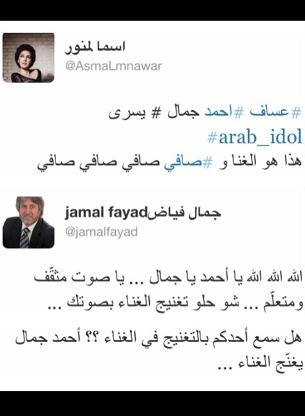 أما أسماء لمنور فقالت: "#عساف #أحمد جمال # يسرى. هذا هو الغنا و #صافي صافي صافي صافي"، وقالت أيضاً: "أحمد رائع واختياره راقٍ ".