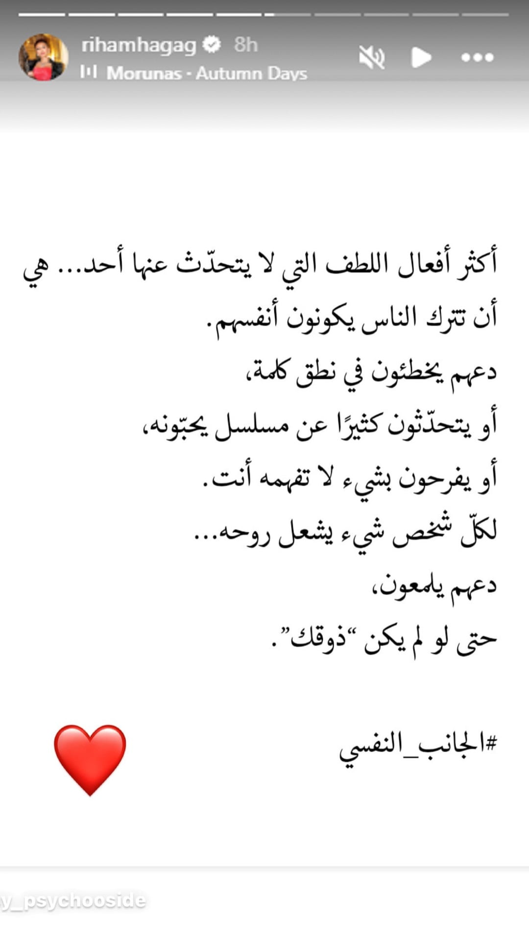 ووجّهت ريهام حجاج من خلال خاصية القصص المصوّرة الملحقة بحسابها الخاص في "إنستغرام" رسالة غامضة تحدثت فيها عن ضرورة ترك الناس يفعلون ما يريدون حتى لو لم تفهم ما يفعلونه أو يتعارض مع ذوقك، حيث كتبت قائلة: "أكثر أفعال اللطف التي لا يتحدث عنها أحد هي أن تترك الناس يكونون أنفسهم... دعهم يخطئون في نطق كلمة... أو يتحدثون كثيراً عن مسلسل يحبونه... أو يفرحون بشيء لا تفهمه أنت... لكل شخص شيء يشعل روحه... دعهم يلمعون حتى لو لم يكن ذوقك".