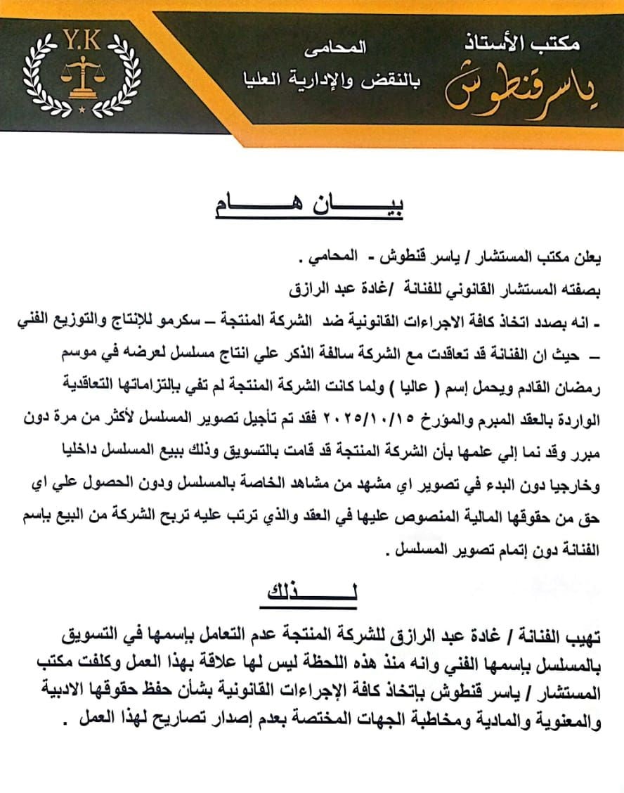وأشار البيان الى أن الفنانة كانت قد تعاقدت مع الشركة على إنتاج المسلسل، إلا أن الشركة لم تلتزم ببنود العقد المبرم معها، وبدأت بتصوير المسلسل في 15- 10 - 2025 من دون علم الفنانة أو أخذ موافقتها، داخل أماكن الشركة الخاصة بالتسويق، ومن دون تصوير أي مشاهد خاصة بها، أو دفع أيٍ من مستحقاتها المالية المتّفق عليها في العقد.