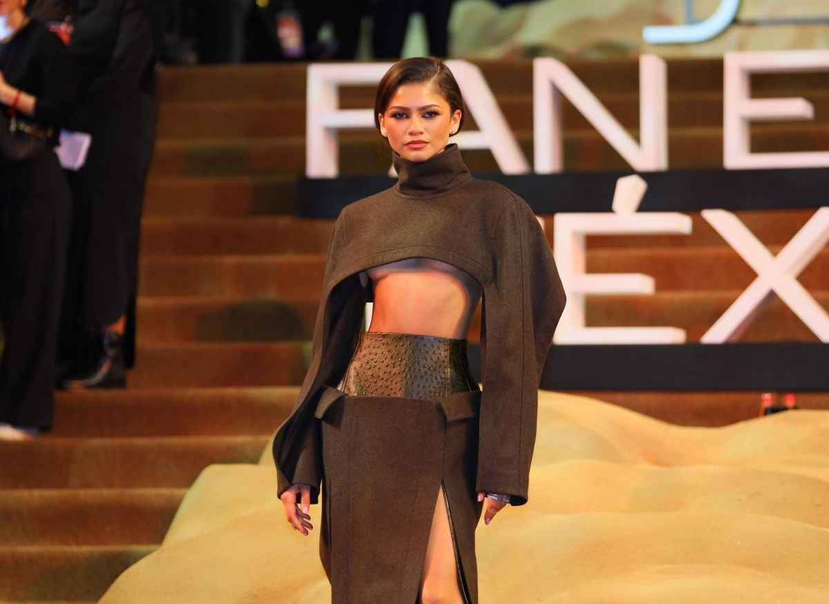 أما تنورتها الطويلة، فواصلت إطلالتها بلمسة عصرية على زي العمل التقليدي، حيث تميزت بحزام خصر ضيّق من جلد التمساح، وجيوب مكشوفة، وشق جانبي طويل. أكملت زندايا إطلالتها في العرض الأول بحذاء "لوبوتان" بنّي داكن، وخلخال فضّي، وشعر مصفّف الى الخلف.