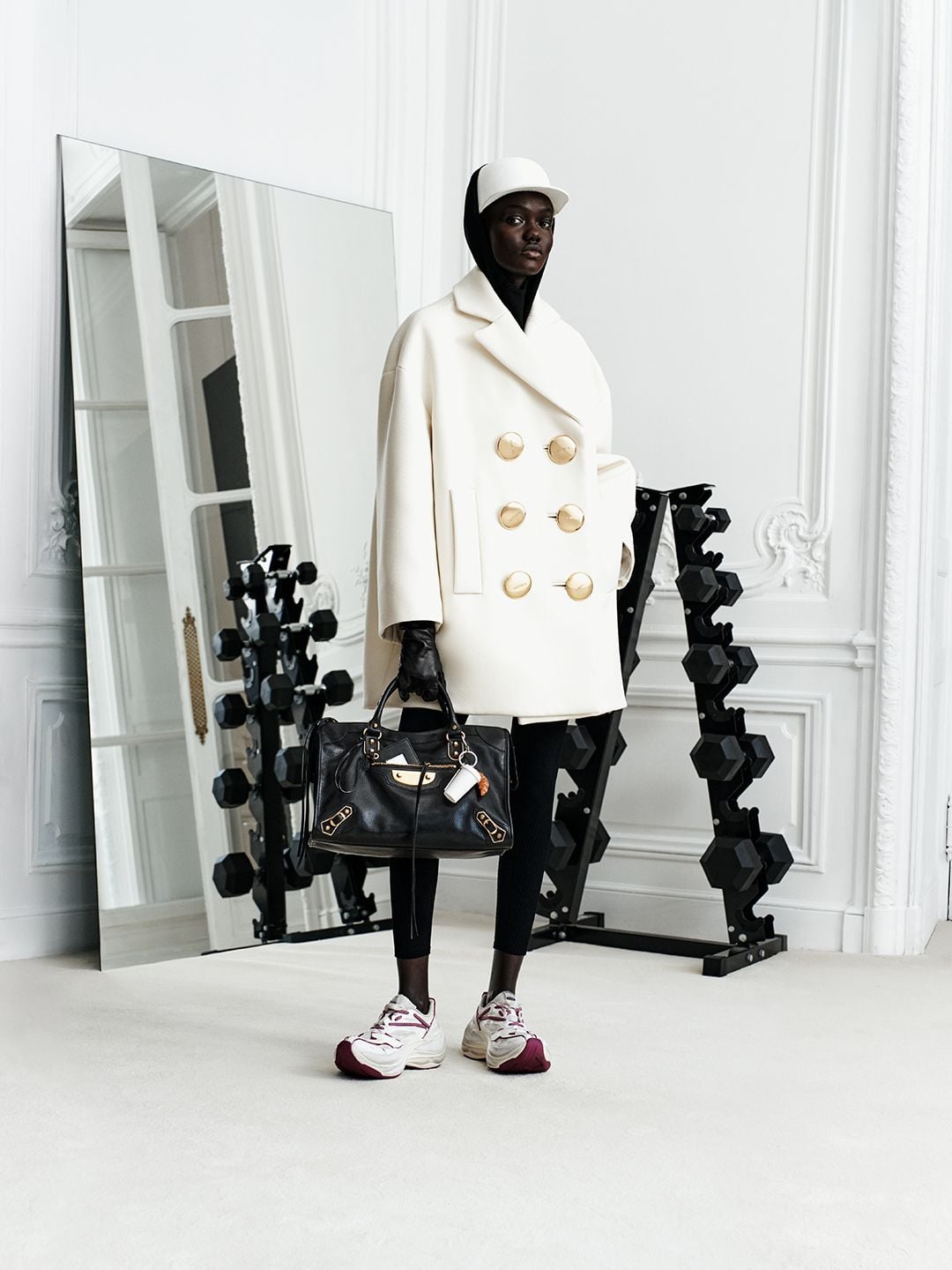 تواصل الإكسسوارات بثّ أجواء من الرقي، إلى جانب طاقة ديناميكية. تُقدَّم حقيبة Le City بشكلٍ جديد أكثر انسيابية، مع silhouette مستقيمة محدّدة بحدة، وإبرازٍ لبُنيتها. وتنضم إليها حقيبة Le 7 بنابّا "مُلبّسة"، بتصميم جديد ومقبض علوي مع طبقة داخلية بسحّاب المجوهرات ذات الطابع المعتّق بالكريستال مباشرةً من تصاميم أرشيفية؛ فيما تنعكس بصمة بالنسياغا في القرن الحادي والعشرين في قناع العين Midnight. وتتميّز أحذية Comfy اللوفر ببطانة داخلية مبطّنة من الليكرا مستعارة من الأحذية الرياضية، لتمنح الرسمية إحساس الشارع وتضع الراحة في الصدارة؛ أما الأحذية الرياضية فتعكس فلسفة الأزياء الراقية لا عبر تباين الخامات، بل من منظور تقني. أحذية Ballet المرنة تُطوى إلى نصفين وتُثبّت بخطاف؛ وأحذية Pocket يمكن ضغطها بسحّاب إلى أبعاد جديدة مُدمجة؛ وأحذية Jet تُنفَّذ بخفّة بلا وزن. وتأكيداً لموضوعات المجموعة، تعبّر حصيرة اللياقة من بالنسياغا عن وعي بالرفاه والعناية.