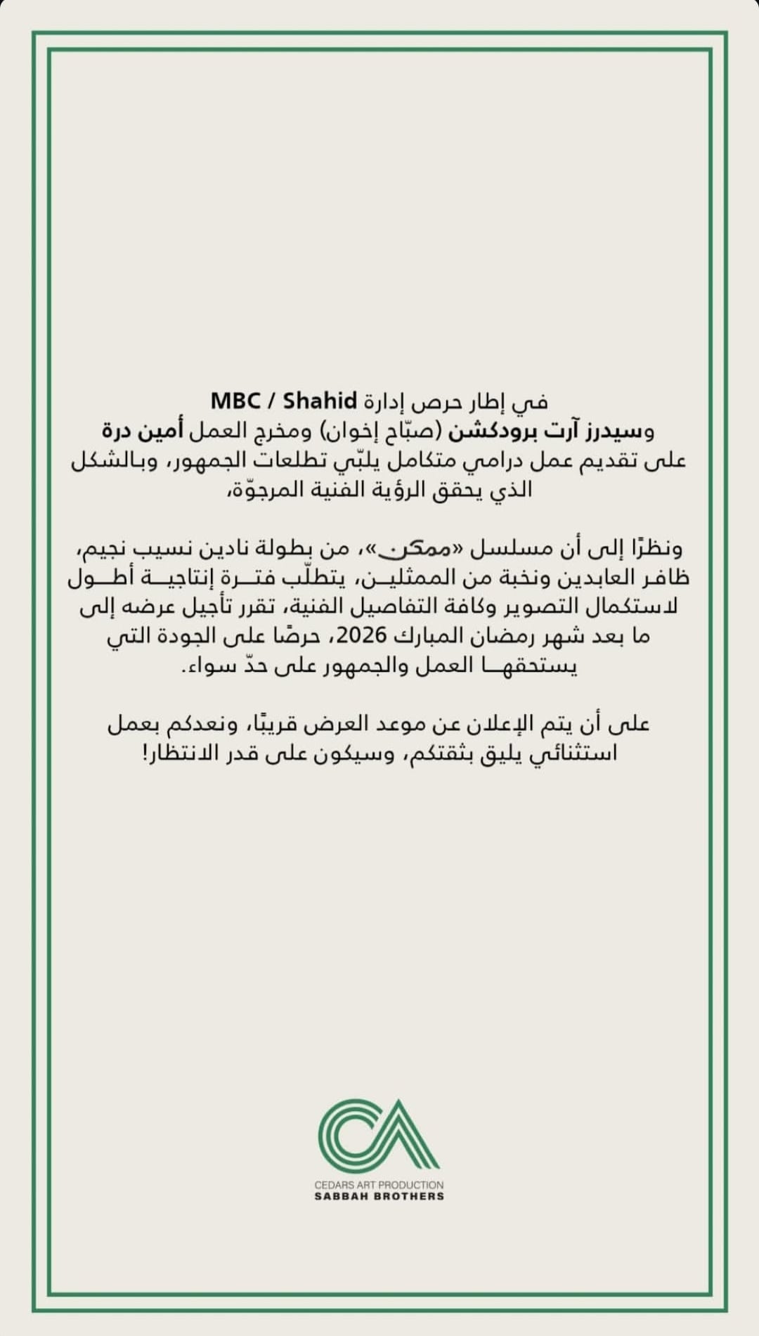 وأكد البيان أنه " نظرا لأن مسلسل (ممكن) من بطولة نادين نسيب نجيم وظافر العابدين، ونخبة من الممثلين، يتطلب فترة إنتاجية أطول لاستكمال التصوير وكافة التفاصيل الفنية، تقرر تأجيل عرضه إلى ما بعد شهر رمضان المبارك 2026، حرصاً على الجودة التي يستحقها العمل والجمهور على حد سواء".