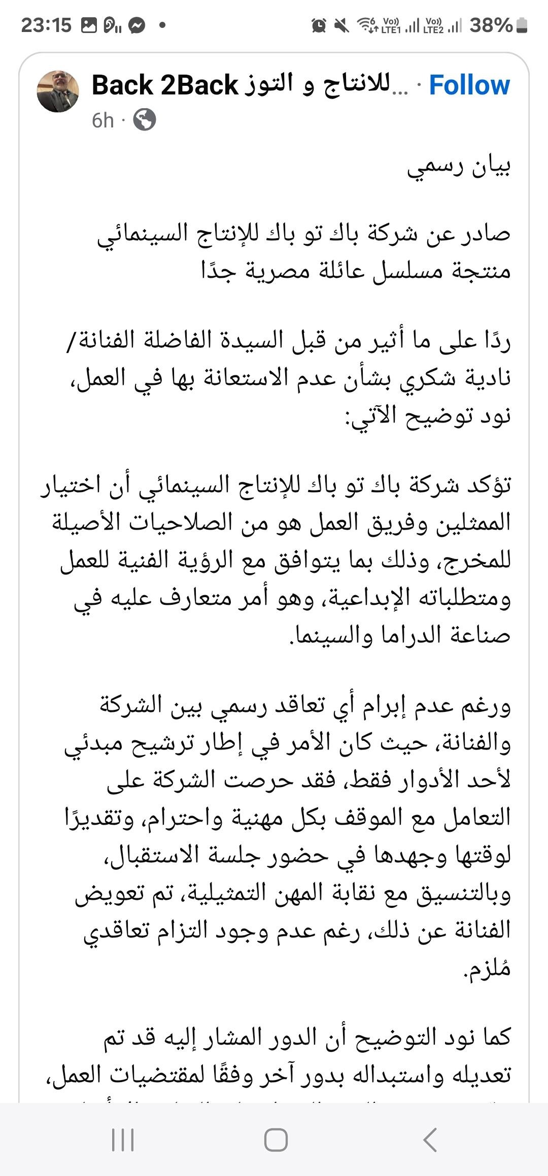 وكان المنتج الدكتور محمد حمزة رئيس شركة "باك تو باك" للإنتاج السينمائي، قد أصدر بياناً رسمياً أكد فيه أن اختيار الممثلين وفريق العمل هو من صلاحيات المخرج، وذلك وفقاً للرؤية الفنية ومتطلبات العمل الإبداعية، وهو نهج متعارف عليه فى صناعة الدراما والسينما، ويهدف في المقام الأول الى خدمة المحتوى الفني وتقديم أفضل صورة ممكنة للجمهور.