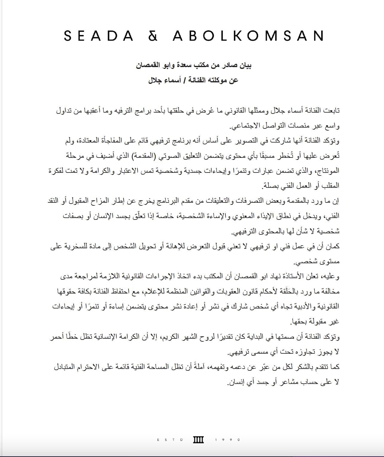 ونشرت المحامية عبر الحساب الرسمي لها على موقع "فيسبوك"، صورة من البيان الذي جاء فيه، أنه بيان صادر عن مكتب "سعدة وأبو القمصان" بشأن موكلته الفنانة أسماء جلال، مؤكدًا أن الفنانة وممثلها القانوني تابعا ما عُرض في حلقتها بأحد برامج الترفيه، إضافة الى ما أعقب ذلك من تداول واسع للحلقة عبر منصات التواصل الاجتماعي.