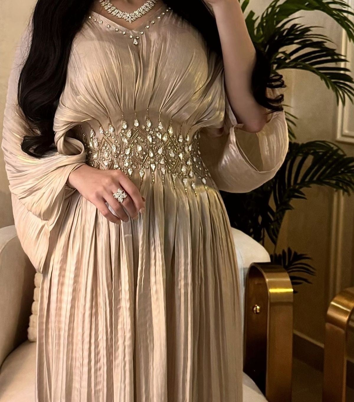في إمكانك ارتداء قلادة من الألماس تتناسب مع حزام الخصر لإطلالة ملكية في مجالس العيد.