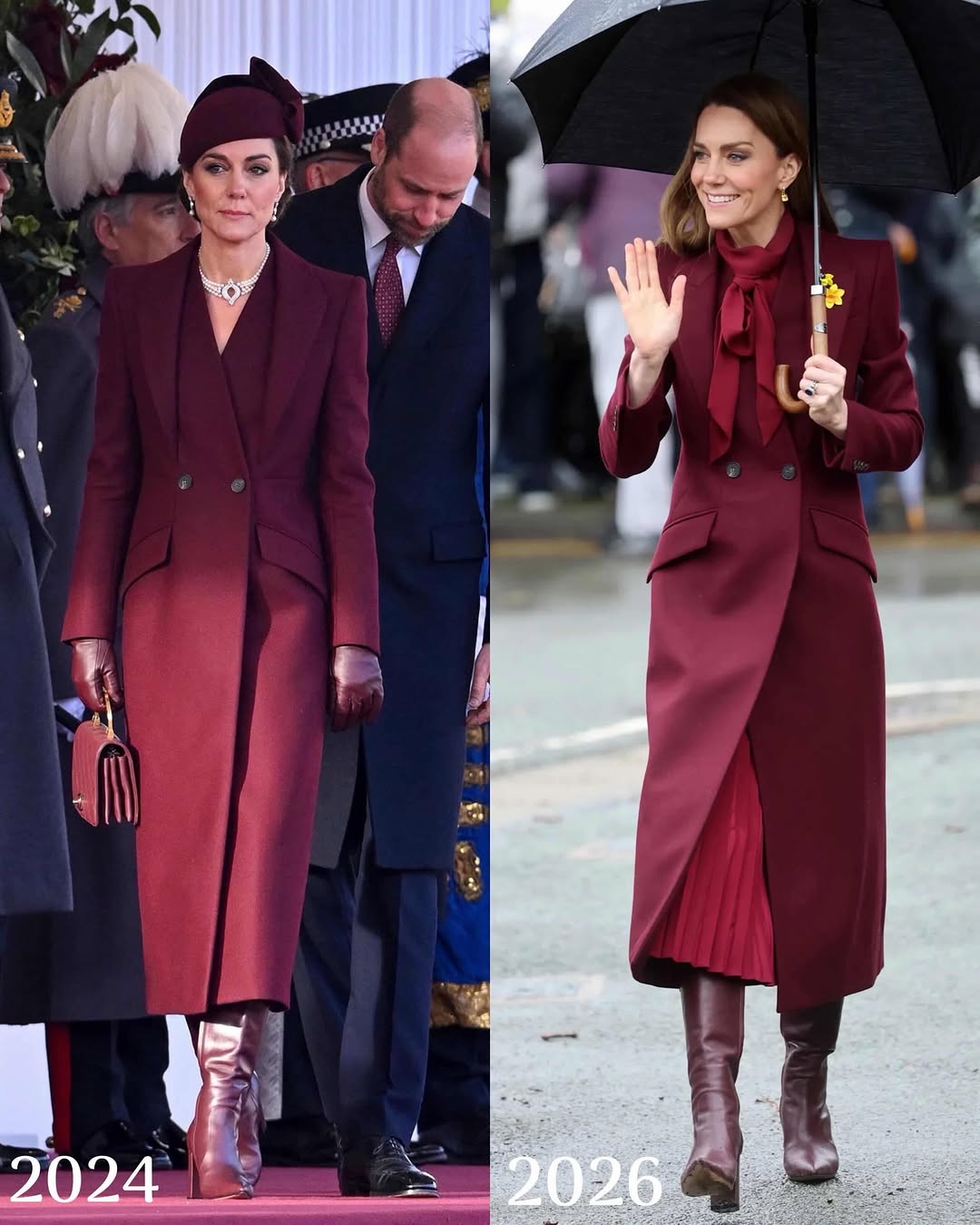 يذكر أنها ليست المرة الأولى التي ترتدي فيها كيت ميدلتون هذه الاطلالة، بل سبق وتألقت بنفس المعطف باللون العنابي الداكن عام 2024، حيث تحرص دائماً على اعادة تدوير ملابسها بطريقة ذكية وبلمسات بسيطة، حيث تخلت في السابق عن الشال وتزينت بقلادة ماسية كبيرة الحجم مع أقراط ناعمة، وأضافت قبعة ملكية مزينة بفيونكة وقفازات جلدية باللون البرغندي وحملت حقيبة صغيرة من الجلد بنفس اللون أيضاً.