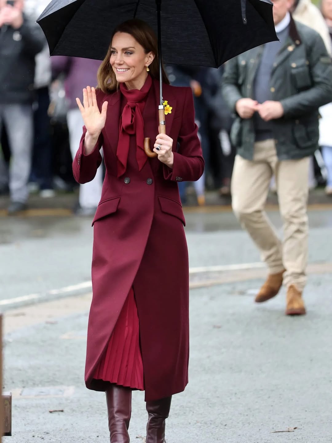 وارتدت أميرة ويلز خلال مشيها بجانب ولي العهد الأمير ويليام تنورة متوسطة الطول بحركة الكسرات الرفيعة باللون البوردو مع بلوزة ناعم، ونسقت معهما معطف طويل بتصميم كلاسيكي باللون البرغندي، وجاء بتنسيق احادي وبقصة كلاسيكية بأزرار عريضة وطيات أمامية مع قبة جانبية بارزة من توقيع (Alexander McQueen)، وتزين المعطف بزهور النرجس الصفراء الصغير، وهو ما أضاف المزيد من الفخامة والرقي الى الطلة النهائية.