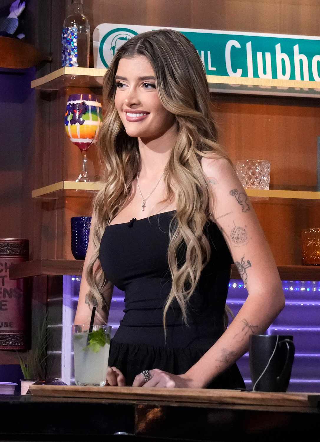 ثم رفعت كمّ قميصها لتُظهر بعض الرسومات على عضلة ذراعها، وأشارت إلى وشمين متجاورين، أحدهما صليب والآخر ملاك صغير. ووصفت الصورة الأخيرة بأنها "أقل وشم مفضل لديها على الإطلاق"، لكنها قالت إنها لم تكن متأكدة من أفضل طريقة لإخفائها.