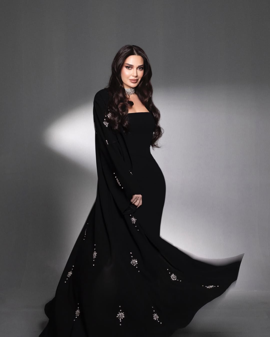 وأطلّت النجمة اللبنانية بفستان أسود بتصميم طويل وضيّق يبرز رشاقتها ونسّقت معه عباءة بأسلوب الكارديغان الأنيق بنفس اللون، وتميزت بأكمامها الواسعة وتصميمها الكلاسيكي المرصّع بحبيبات الشواروفسكي اللامع بأشكال أزهار كبيرة الحجم، أضافت لمسة من الفخامة والرقي الى إطلالتها الرمضانية الأنيقة.
