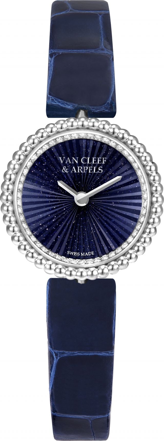 يكشف هذه الإبداع عن دائرة يحيط بها صفّان من الحبيبات الذهبية، المصقولة بعناية فائقة لإبراز إشراقتها الكاملة. وتحت الكريستال المحدّب برفق، يكشف وجه الساعة عن ديكور من زجاج الأفنتورين، حيث تعكس تدرّجاته الزرقاء الداكنة عمق الكون اللامحدود. وتتميّز هذا المادّة بمظهر غيوشيه مشعّ، في تقنية مبتكرة تُغني عملية التلاعب بالضوء، ويضفي بريقها الكثيف حيوية على مرور الوقت كما تشير إليه العقارب.