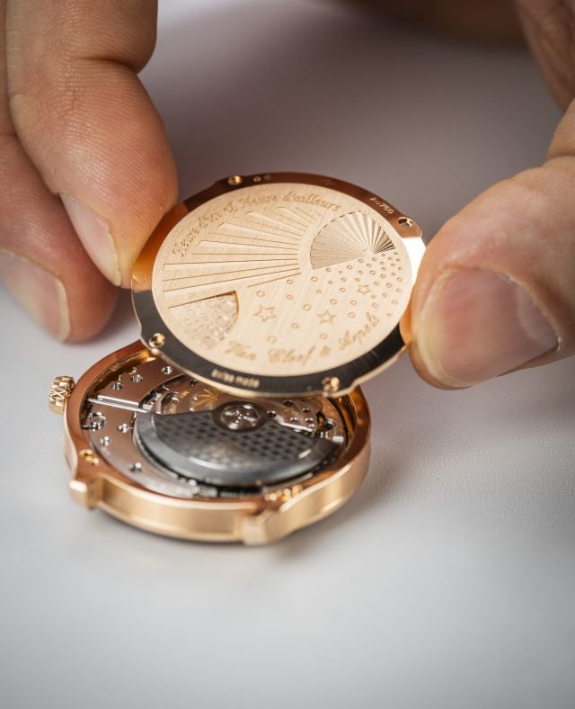 ويظل هذا المشهد مرئياً عند الطلب حتى عندما يكون القمر محجوباً خلف الستار، وذلك بفضل زرّ موجود على حافة الساعة. وعند تفعيل الحركة، يدور وجه الساعة دورةً كاملةً بزاوية 360 درجة لمدة تقارب الـ 10 ثوان، كاشفاً عن تابع الأرض في مشهد مرصّع بالنجوم. وتستكمل الرواية على ظهر الساعة، مع حفر في الذهب الأبيض يستعيد سمات سطح القمر. وتصوّر الأرض في رسم من المينا على كريستال السافير فوق الوزن المتذبذب. ويزين الكريستال نفسه بكواكب نفذت بطريقة الرسم المصغّر، وهي تتلألأ برفق مقابل خلفية بزخرفة غيوشيه. أما ظهر الساعة فيعكس المنظور الذي يستعرضه وجه الساعة.