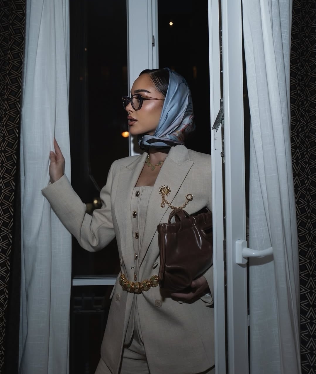 تألقت الفنانة المغربية ببدلة أنيقة باللون البيج من ثلاث قطع، عبارة عن توب بأزرار كبيرة الحجم، وبنطال بتصميم كلاسيكي، وأُضيفت إليهما سترة مفتوحة مزيّنة بأزرار بتصميم مميّز، مع حزام رفيع تُزيّنه أكسسوارات دائرية باللون الذهبي. وأكملت إطلالتها الأنيقة ببروش على شكل سلسلة ذهبية، وأضافت وشاحاً حريرياً بتموجات اللونين البنفسجي والأسود.
