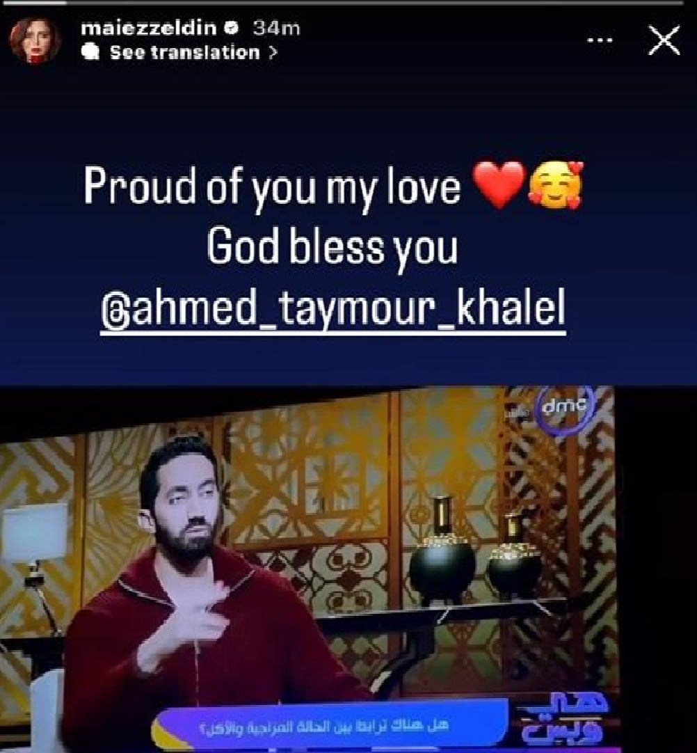 نشرت الفنانة مي عز الدين، عبر خاصية القصص المصوّرة الملحقة بحسابها الخاص في "إنستغرام"، صورة لزوجها مدرّب اللياقة البدنية أحمد تيمور خلال ظهوره ضيفاً في برنامج "هي وبس" مع الإعلامية رضوى الشربيني.