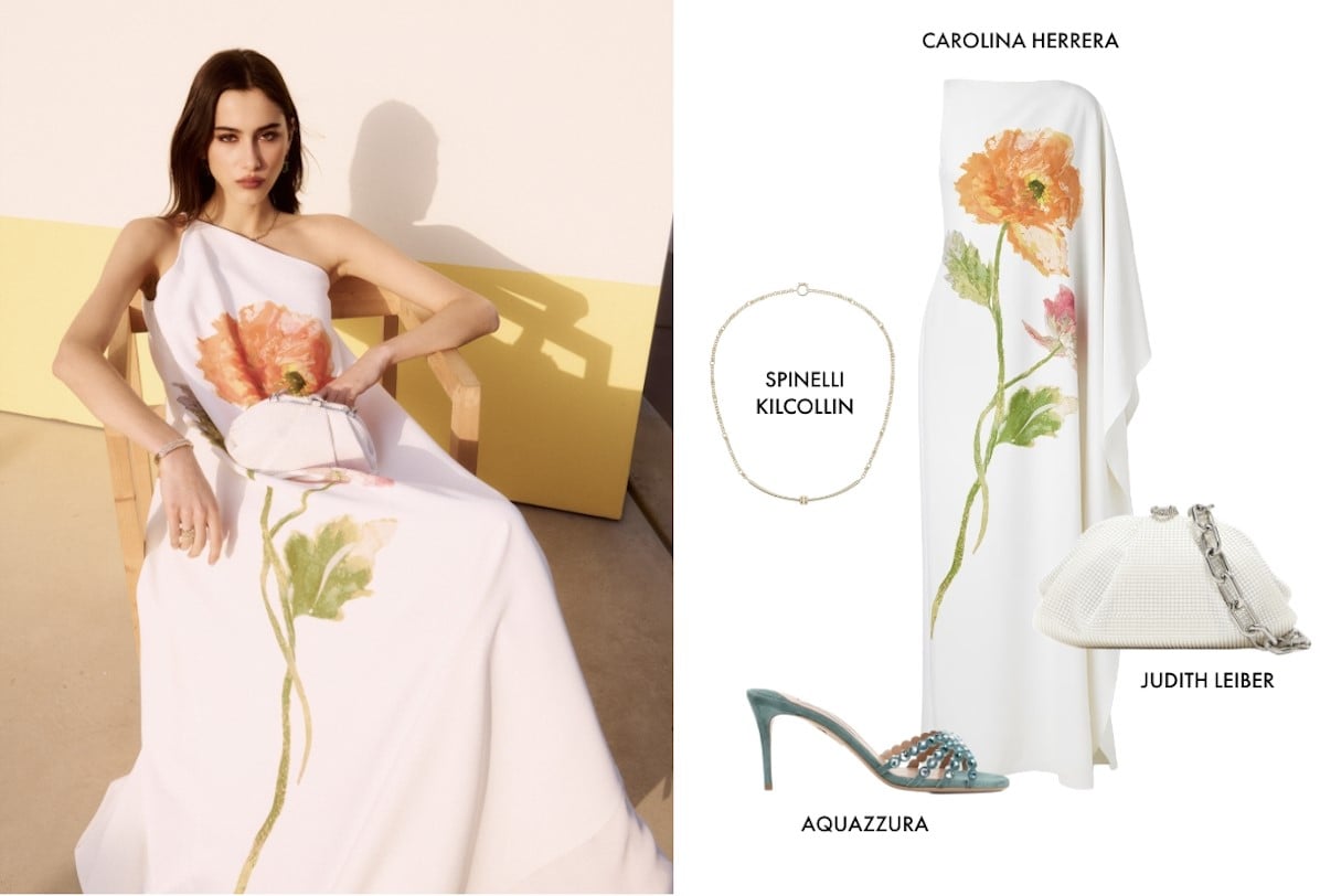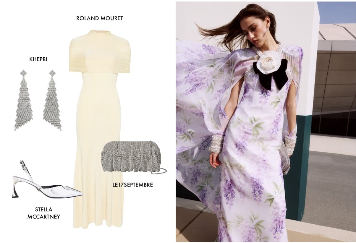 احتفلي بالألوان والبريق. أقمشة شفافة بألوان الباستيل، أحذية معدنية لامعة، وحقائب مرصّعة — إطلالتك المثالية لحفلات الزفاف في النهار.