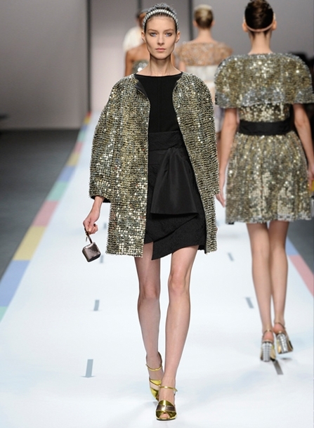 اختارت النجمة الأنيقة إلسيا معطفاً قصيراً براقاً من Fendi ارتدته مع سروال قصير وجوارب داكنة، بينما ارتدته العارضة مع حذاء ذهبيّ وأكسسوار على شعرها.