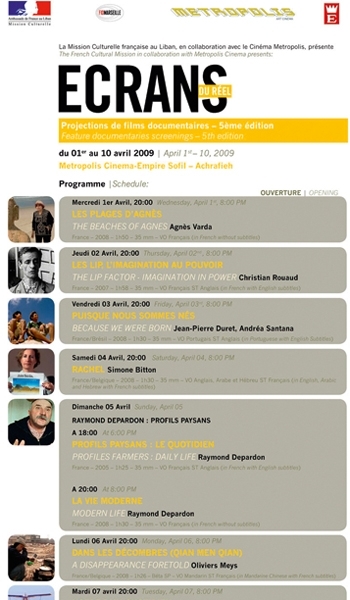 نظّمت البعثة الفرنسية التابعة للسفارة الفرنسية في لبنان بالتعاون مع سينما ميتروبوليس عرضاً للأفلام الوثائقية تحت عنوان «شاشات الواقع». وقد اختير لحفل الإفتتاح فيلم «شواطئ آنييس» The Beaches of Agnes للمخرجة آنييس فاردا، وهو فيلم وثائقي من نوع السيرة الذاتية، يرصد تجربة إمرأة مثيرة للفضول والجدل. والمفارقة أنّ المخرجة نفسها هي التي تسرد في الفيلم قصتها بأسلوب فيه الكثير من الفكاهة والغرابة. ومن الأفلام التي عُرضت أيضاً The lip Factor- Imagination in Power لكريستيان رواد و Because We Were Born للمخرجين جان بيار دوريه وأندرييه سانتانا وفيلم «راشيل» للمخرجة سيمون بيتون الذي يروي قصة ناشطة السلام الأميركية راشيل كوري التي دهستها الجرّافة الإسرائيلية عندما كانت تمنعها من هدم منزل عائلة فلسطينية، و«راشيل» يُمثّل أجمل معاني الإلتزام والمثالية واليوتوبيا السياسية ... أمّا فيلم الإختتام, فكان للمخرج الجزائري مالك بن اسماعيل «الصين ماتزال بعيدة» الذي تدور أحداثه بين الحاضر والماضي الجزائري، كما يعرض الفيلم ذكريات حقيقية مؤثّرة ومعقدة من جوف الذاكرة الجزائرية بلغة مباشرة وصريحة.