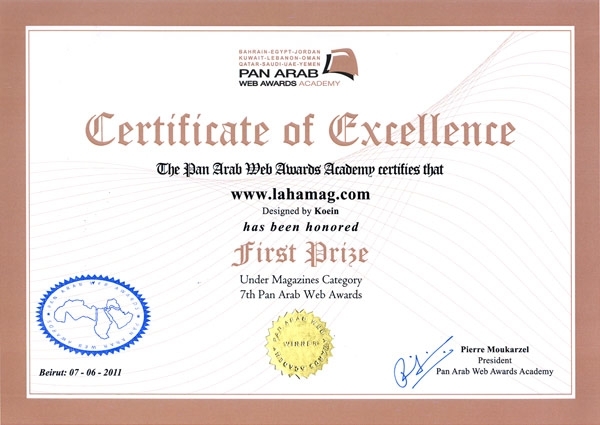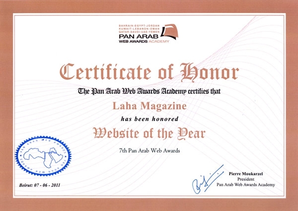 عقدت البارحة في فندق الفينيسيا-لبنان، الدورة السابعة لجائزة درع المواقع العربية برئاسة رئيس لجنة Pan Arab Web Award Academy السيد بيار مكرزل وحضور لجنة التحكيم والعديد من السفراء العرب ورجال الأعمال وممثلي المواقع الإلكترونية في العالم العربي. وقد تمّ توزيع الجوائز على المواقع الإلكترونيّة الرابحة في مجالات عدّة منها: الإعلان والإنتاج، شركات الطيران، الفن والتصميم، المصارف والمؤسسات المالية، الثقافة، التربية، الضيافة، الفنادق، التأمين... المجلات والصحف التي تستجيب لمعايير رفيعة المستوى في الإبتكار والتصميم، والتنفيذ والمضمون الهادف، ومدى تفاعل زوار الشبكة العنكبوتيّة مع هذه المواقع وانتشارها. وقد حصد موقع لها lahamag.com الجائزة الأولى في فئة المجلات. كما حازالموقع على جائزة أفضل موقع إلكتروني لسنة Best Website of the year 2011 وقد تمّ اختياره من بين 600 موقع مشارك ليحظى بدرع الدورة الماسي .