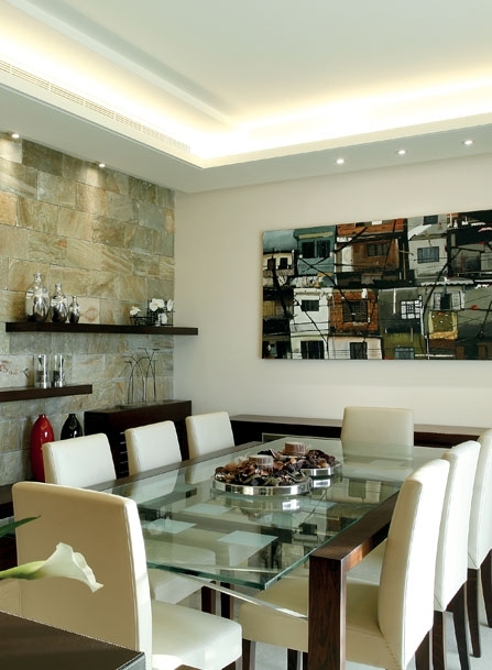 غرفة الطعام بسيطة التصميم، قاعدتها من الخشب ووجهها من الزجاج، ومقاعدها باللون البيج. اللوحة الزيتية على الجدار أضفت حياة على المكان بتعدّد ألوانها وتصاميمها العصرية.