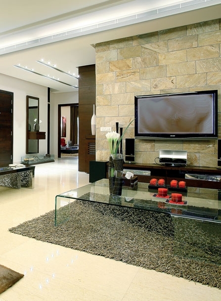 هذا الجدار إمتدّ من قاعة الجلوس إلى غرفة الطعام، وتوزّعت عليه الرفوف، خصوصاً في أوّل جلسة، حيث علّق جهاز التلفزيون وتحته الخزانة المستطيلة المخصّصة للاغراض الخاصة بالتلفزيون، إلى جانب الرفوف المعلّقة إلى يمين التلفزيون كما على حائط غرفة الطعام. جناح هذا الحائط طغى عليه اللونان البني والبيج.