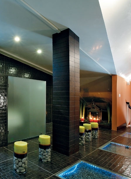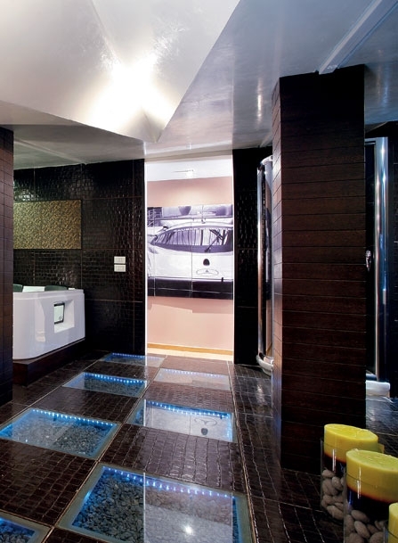 أما الطبقة العلوية فمخصّصة للاستجمام والراحة النفسية والجسدية معاً، بحيث أنّ هذه المساحة العلوية من الأجواء اليابانية ضمّت سونا وجاكوزي على مساحة مفتوحة يفصل بينها الزجاج الشفاف، وبلاطها من السيراميك الذي ارتدى الجلد البنيّ المرقّط.