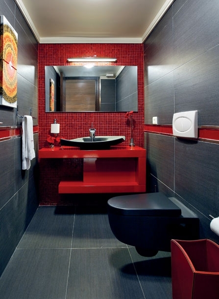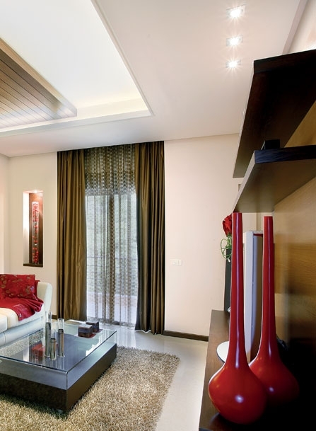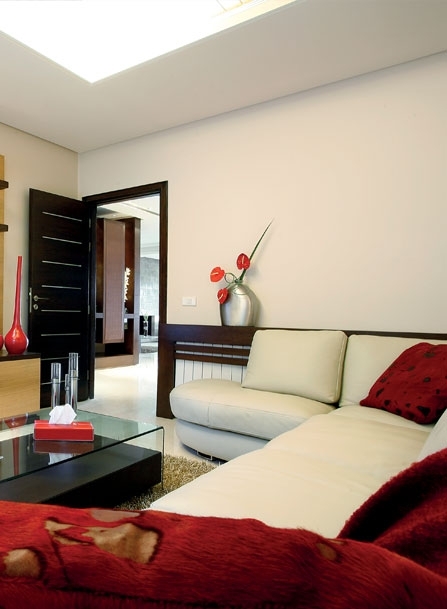 الألوان النضرة والموحّدة عنوان هذا المنزل في كلّ الجلسات من دون استثناء. غرفة الجلوس من المقاعد البيض الوثيرة شكّل فيها اللون الأحمر في الأكسسوار والأرائك واللوحة الزيتية علامة فارقة. كما أنّ اللون الاحمر شغل حمام الضيوف إلى جانب البورسولان الرمادي.
