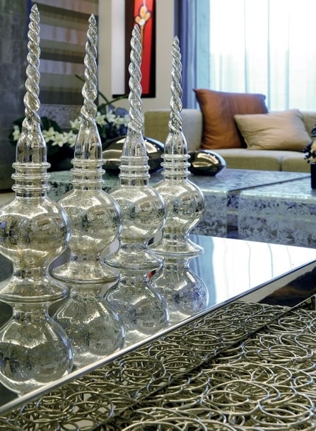 وضعت على الطاولة العلوية أربعة شمعدانات من الزجاج بالشكل نفسه، إلى جانبها حجارة بحرية لكن من البورسولان المرسوم.