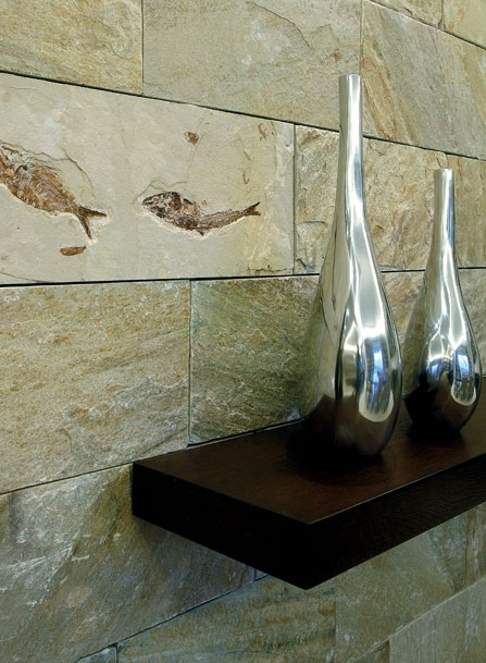 وقبل الإنتقال إلى بقية الصالونات، يستوقفنا الجدار من الحجر الطبيعي البركاني الذي انطبعت فيه أشكال السمك، ويعود إلى عصور تاريخية، ويشبه جدران المدينة الأثرية اللبنانية جبيل.