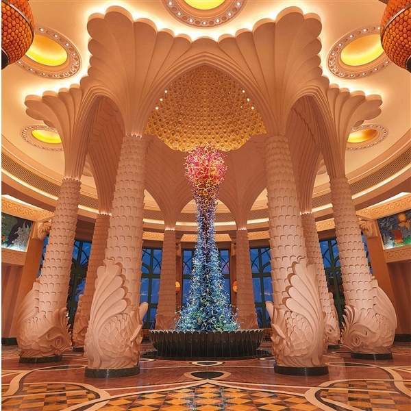 تحفة فنية تنقل ألوان البحر ومخلوقاته من أزرق وأخضر وبرتقالي وأحمر على شكل قطع من الزجاج المنفوخ تبلغ 3000 قطعة.
