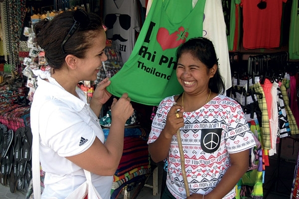 عاد المركب إلى الإبحار نحو جزيرة بيبي Phi-Phi لنتناول الغداء هناك في أحد المطاعم. تضم الجزيرة قرية للصيادين دخلنا في متاهاتها وتجولنا في سوقها. كل شيء يبدو أنه يحتفل السكان والزوار متاهة من الألوان والروائح والنكهات.