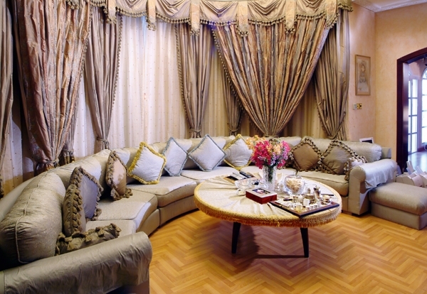 وتنسدل الستائر معظمها من خلف كورنيش خشبي لتطأ الأرض، وتجمعها روح واحدة وتصميم فريد وتتغنّى بألوان ترابية لتنسجم مع ألوان أقمشة الأثاث وأجواء المنزل الدافئة.