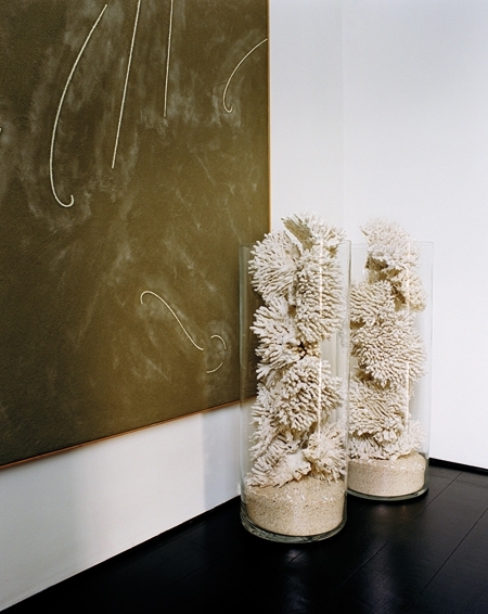 يهيمن على جو الغرفة صور لأثنين من الكلاب الرشيقة من تصوير وليم ويغمان. أما الأبواب الكبيرة للغرفة، فقد نفذت من خشب السنديان المطلي باللون البني الداكن.
