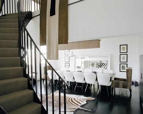 وطرحت على الأرض الى جانب الطاولة بساط تقليد لجلد الحمار الوحشي، مما أضفى طابعاً خاصاً يذكر بأجواء جنوب أفريقيا. وفوق الطاولة تتدلى ثريا حديثة مستطيلة الشكل من أبتكار مهدافي أيضاً. وعلى الجدار المقابل لطاولة السفرة، اختارت كيلي مرآة عملاقة بإطار خشبي أبيض، من تصميم مهدافي. وعلى جانبي المرآة علقت مجموعة من الصور بالأبيض والأسود. وتفصل بين مساحة السفرة ومساحة الصالون، دوائر متلاصقة معلقة من ابتكار كيلي والى جانبها مقعد مغطى بالمخمل الأصفر يعود الى عام 1920. تقول كيلي: «إستخدام الأشكال المتباينة للأثاث، من أجل خلق أثارة بصرية، هو أمر طبيعي بالنسبة إلي، ودائماً ما أزاوج بين أقمشة مختلفة بطريقة فجة».