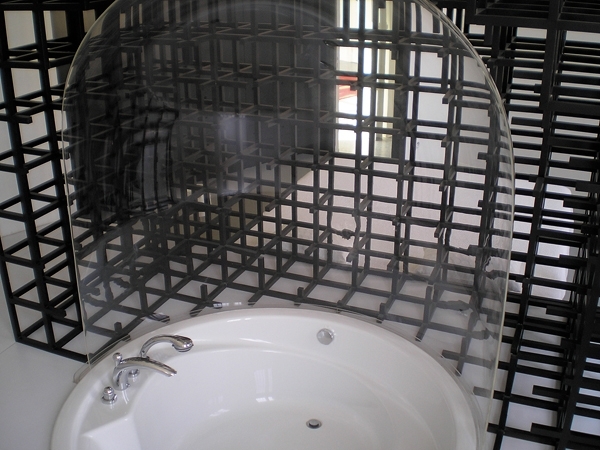 وجاءت المرايا التي تعلو عناصر أثاث خشبية باللون الأيبض على طول الجدار المقابل والتي نصبت عليها مغاسل مستديرة لا تظهر إلا عند الاقتراب منها. ولكي تحمي السرير من رذاذ ماء الحوض الملاصق لرأس السرير، نصبت عنصراً زجاجياً أسطوانياً وينتهي بتكويرة تشبه تكويرات الحمامات الشرقية.