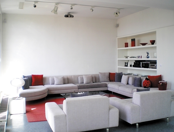 هذه العناصر سنجد ما يذكرنا بها حين نصل الى الصالون، بكنباته البيضاء، تتوسطها طاولة زجاجية تظهر من تحتها سجادة حمراء مشابهة لتلك التي في المدخل. ولإضفاء حركة أنيقة على الجو في الصالون، كان لا بد من الأستعانة ببعض الوسائد الحمراء التي تم توزيعها بين الوسائد البيضاء والرمادية التي تحلي الكنبات. وكذلك تمت الأستعانة ببعض المقتنيات باللون الأحمر لوضعها على الأرفف المدمجة بالحائط والتي أفسحت بعضها المجال لأجهزة الموسيقى.