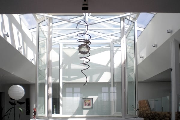 وأمتد العمل ليشمل بعض نواحي السقف، فأزالته واستبدلته بتشكيلات من هياكل معدنية يعلوها زجاج شفاف يتيح دخول ضوء الشمس ويجعل السكن هنا أشبه بالسكن في مركبة تسبح في الفضاء اللامتناهي.