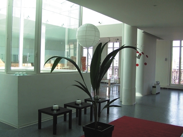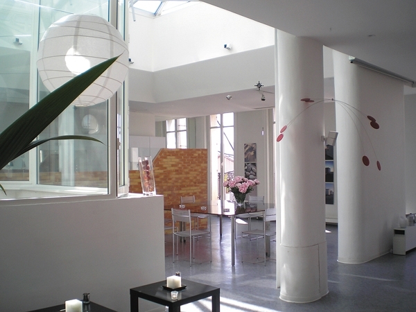 مباشرة بعد تجاوز باب المدخل، نصير في عالم آخر يختلف تماماً عن المبنى والحي معاً. عالم رحب مفتوح يسبح في الضوء ويستحم بالنور المتسرب من كل مكان.
