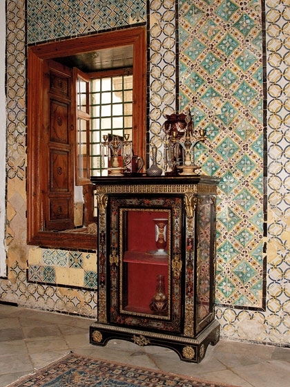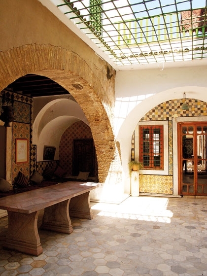 وبما أنّ الموزاييك هو رمز الهندسة التونسية، فقد تكرّر في كلّ الجلسات تقريباً، وإحتلّ الجهة السفلية لجدران الصالونات، إذ إنّ السقف مقبّب ومطلي باللون الأبيض. وعلٌّقت على هذه الجدران المرايا واللوحات الزيتية التراثية. وفي ركن من قاعات الاستقبال إحتلت آلة البيانو بحجمها الكبير ركناً خاصاً بها، فالمالكون يهوون الفنّ على أنواعه، من الرسم إلى الموسيقى. لوحة الفخامة اكتملت مع تناثر قطع الكريستال الفاخر باللونين الأبيض والأزرق، إلى جانب السجاد من الطرازين الهولندي والعجمي.
