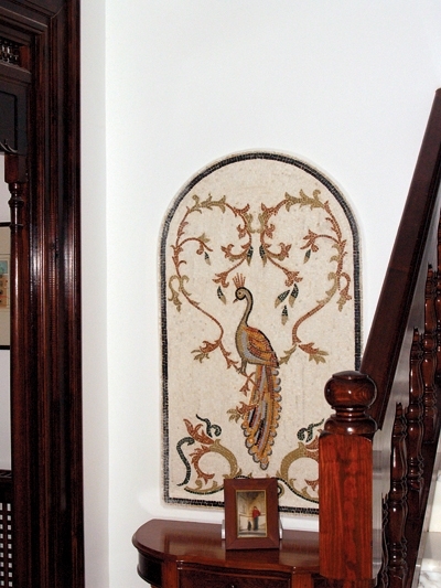 وإرتفعت فوقها لوحة من الموزاييك تجسّد قرطاجة رسماً وتصنيعاً. وفي الصالون وغرفة الطعام المتقابلين تدلّت ثريتان في كلّ جلسة من التصميم نفسه، وهي من الكريستال الفاخر بشكل مصابيح.
