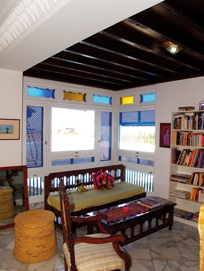 أما مقاعد هذه الجلسة فتونسية الصنع من الخشب المزخرف. وإرتدى السقف حلّة من خشب السنديان، مما أعطى جواً دافئاً في غرفة المكتبة التي يحلو فيها الإسترخاء للمطالعة في هذه المجموعة من الكتب التي خصّص لك منها مربّع، إذ إنّ المكتبة عبارة عن مربّعات وضعت جنباً إلى جنب.