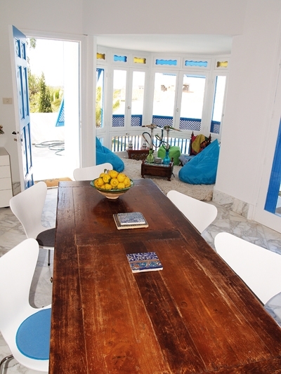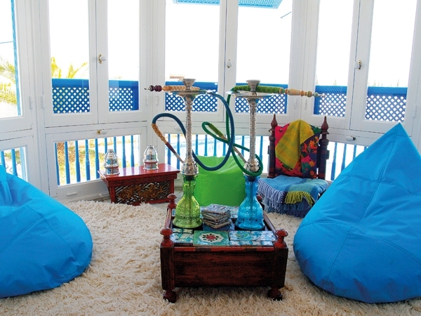 غرفة الطعام تنفتح على ركن مخصص للنراجيل، بحيث تحوّلت الشرفة إلى مكان مغلق بفضل الزجاج الذي تقاطع معه الخشب الأبيض بشكل شبه دائري، والزجاج العلوي عبارة عن مربعات باللون الأزرق تماشياً مع الألوان الخارجية للجدران والنوافذ، لذلك وضعت المقاعد من الجلد باللون الازرق لتكتمل اللوحة المنسقة الألوان.