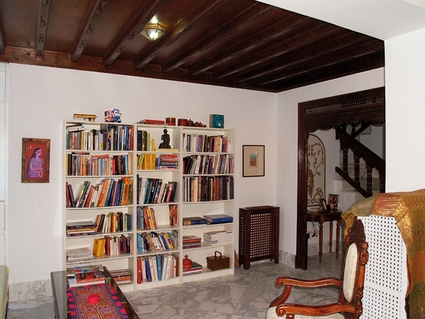 والكتب التي لم تتّسع لها المكتبة وضعت في كونسول من الخشب باكستاني الصنع. المزيج الهندسي برز جلياً في هذه الغرفة من خلال المدخلين، إذ يمكن الوصول اليها من باب الصالونات الرئيسي الكبير الحجم ذي الإطار الأبيض العصري.