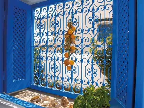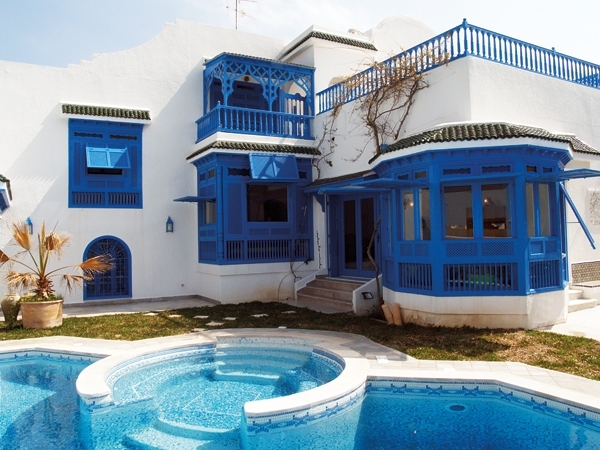 اللون الأزرق للنوافذ والابواب والذي هو لون الأمل والحياة بالنسبة إلى معظم بيوت تونس، قابله اللون الأزرق في الحديقة حيث حوض السباحة يتميّز بمستويات وأشكال هندسية عدة متداخلة، وحيث الشتول الخضراء التي حدّدت إطار المنزل الخارجي لتزينه الى جانب الحديد المزخرف للأبواب الخارجية التي تقفل على مكنونات هذا المنزل الفريدة.