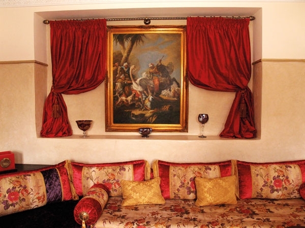 أما اللونان المعتمدان فهما البني والبيج، تداخل معهما البوردو في أحد الصالونات فأرخى طابعاً من الفخامة والفرح. ولأن الديكور كلّ متكامل، فقد تلوّنت الجدران بما يلائم الأثاث، وتدلّت من السقوف ثريات متناهية الأناقة تحاكي الأسلوب المغربي.