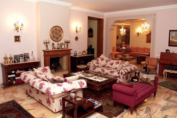 وكما يوحي المنزل البهجة والفرح من الخارج، بجدرانه المطلية باللون الزهر والمطعّمة بالأزرق، ينسحب الأمر نفسه على الداخل. فمعظم الجلسات قماشها زاهٍ. البداية من أحد الصالونات في الطبقة الأولى حيث قاعات الإستقبال، بالقماش الأبيض المطعّم بورود بنفسجية. كنبتان ضخمتان متقابلتان تفصل بينهما طاولة بنية يتخلّلها لوح من زجاج، وعلى مقربة تستريح مدفأة في وسط الحائط.