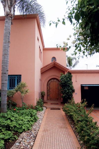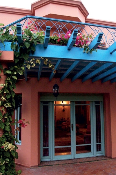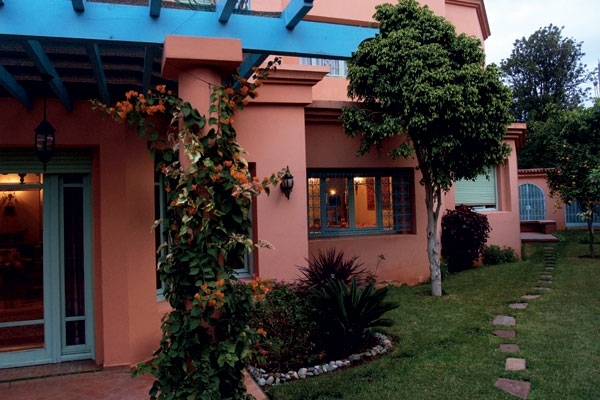 نحن في بيت الأحلام، وتحديداً الأحلام الوردية، بما أن اللون من الخارج زهري. منزل برادا نهلا يستقبل زواره بفرح، ويفتح ذراعيه حتى لعابري السبيل. عاملان يجذبان الناظر: الهندسة الخارجية والديكور الداخلي، وفي كل منهما عناوين ومحاور لا تنتهي. وإذا كان لون الأحلام وردياً كما هو شائع، فإن هذا المنزل المغربي مبني من حلم حجاره زهرية. ما أن تقع العين عليه حتى يخال الرائي أنه أمام ضرب من ضروب الخيال: هيكل زهري ضخم يزنره الإخضرار وتكحّله نوافذ زرقاء، وينبسط أمامه حوض سباحة ذو قعر أزرق منقوشة جنباته برسوم هندسية. كأنها سجادة مستلقية في لجّة الماء. ومع أن هندسته الخارجية غير متناسقة تماماً من حيث الحجم والخطوط، فإن هذا العامل يعدّ جاذباً إضافياً.